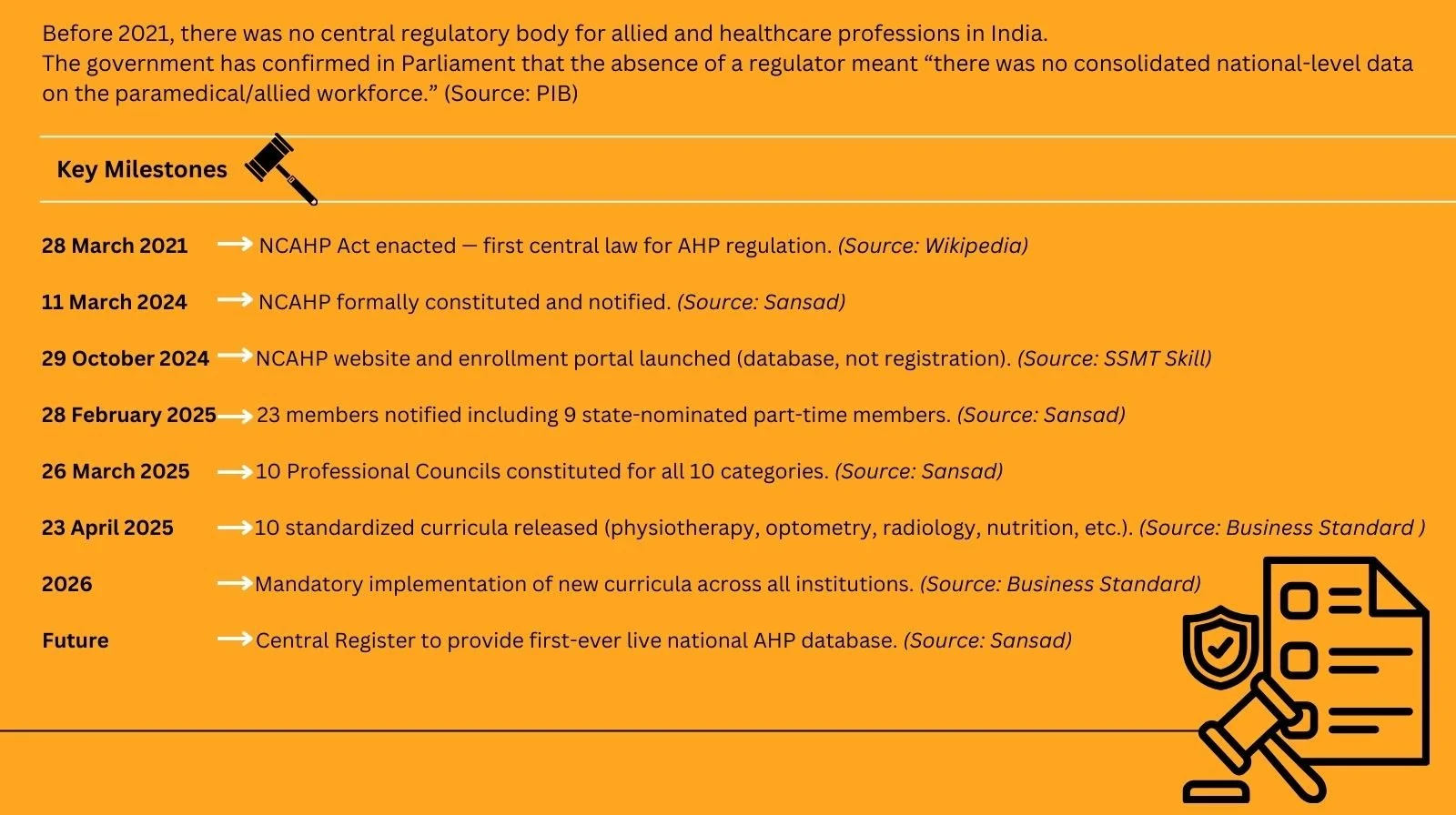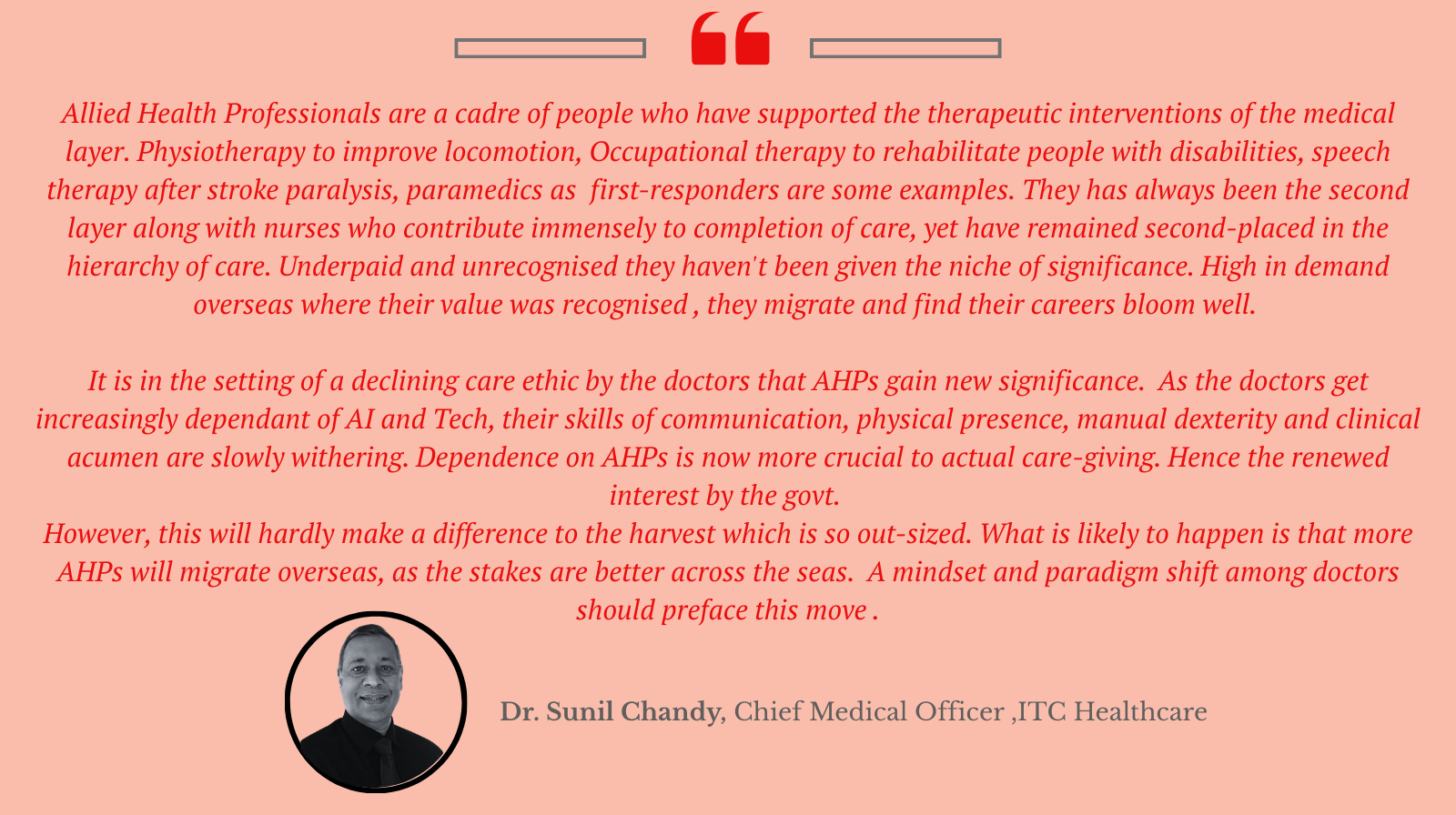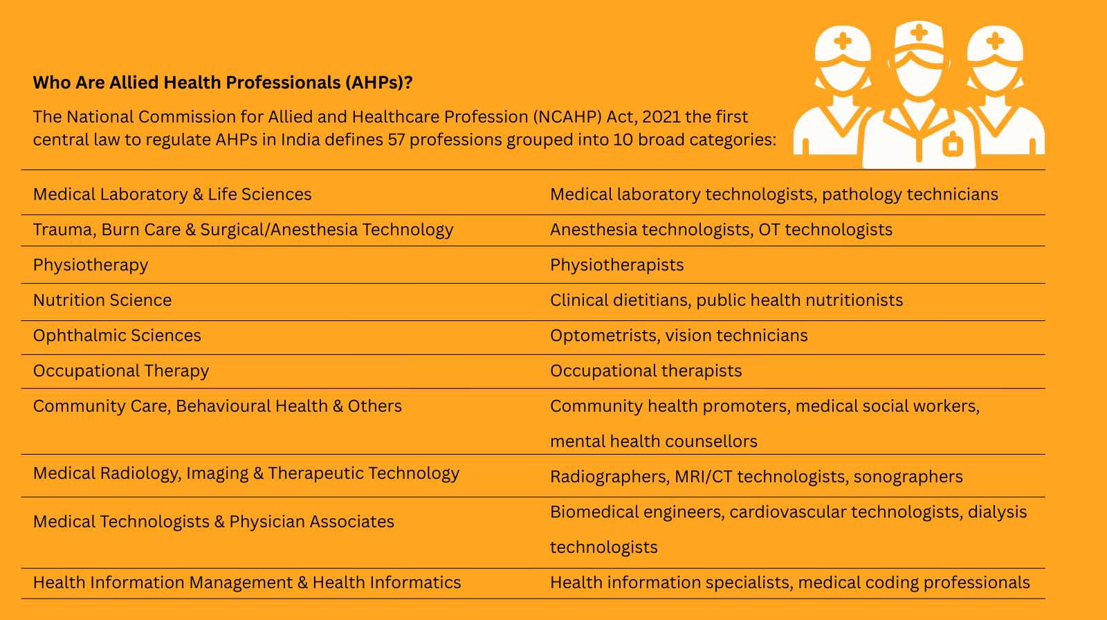 Dr. Girdhar Gyani, Director General of the Association of Healthcare Providers (India), points out that while doctors and nurses have long been regulated by statutory bodies, allied health professionals had no such commission until the National Commission for Allied and Healthcare Professions Act was enacted in 2021.
