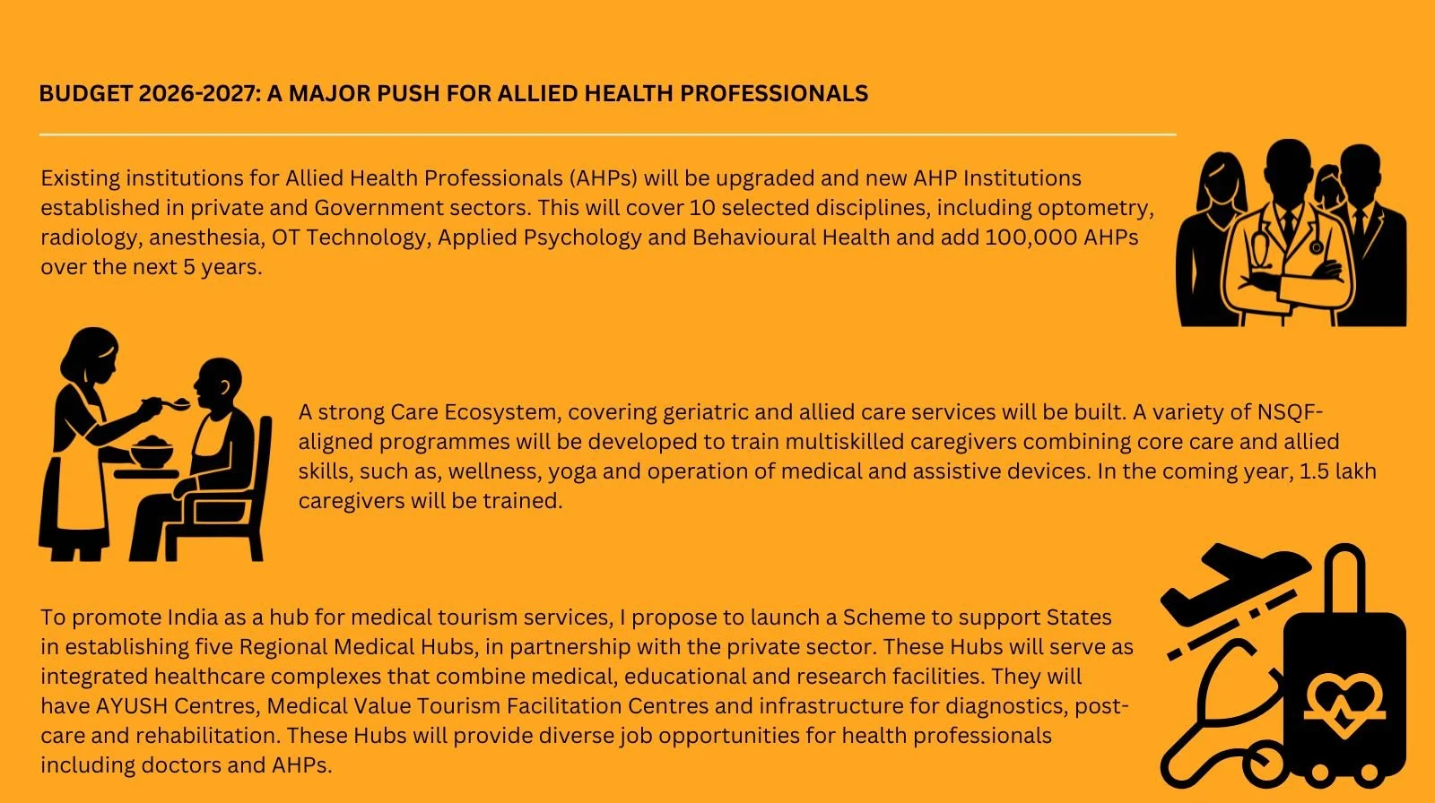 On February 1, Finance Minister Nirmala Sitharaman announced that India would train one lakh allied health professionals over the next five years, spanning 10 disciplines including optometry, radiology, anaesthesia, and behavioural health. The allocation: ₹980 crore for upgrading existing institutes and building new ones, marks one of the most ambitious policy interventions for AHPs since the National Commission for Allied and Healthcare Professions Act was passed in 2021.