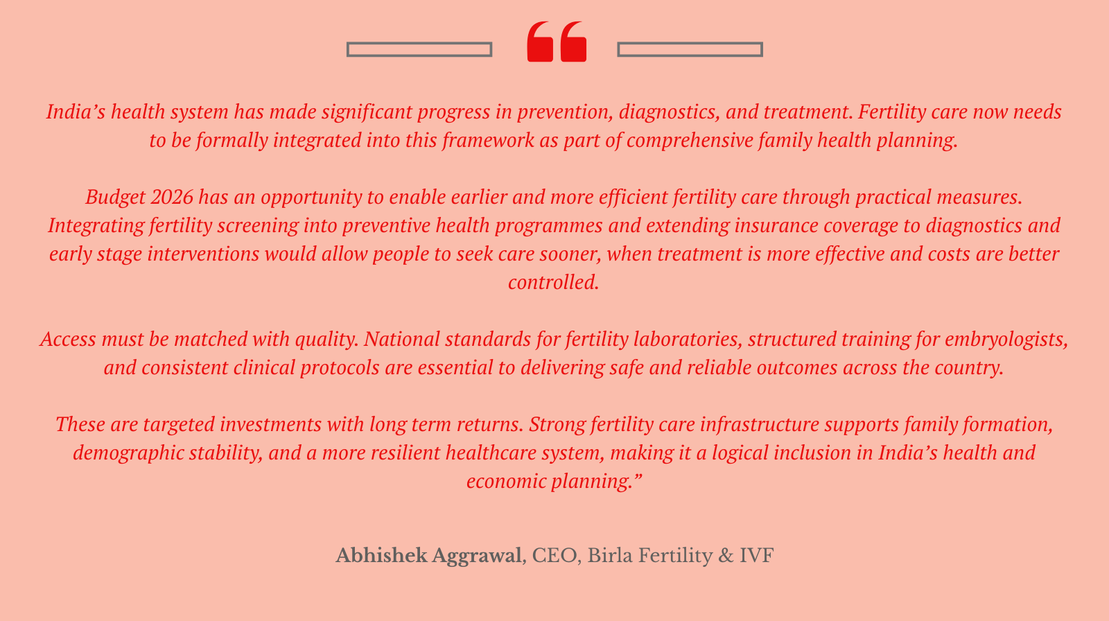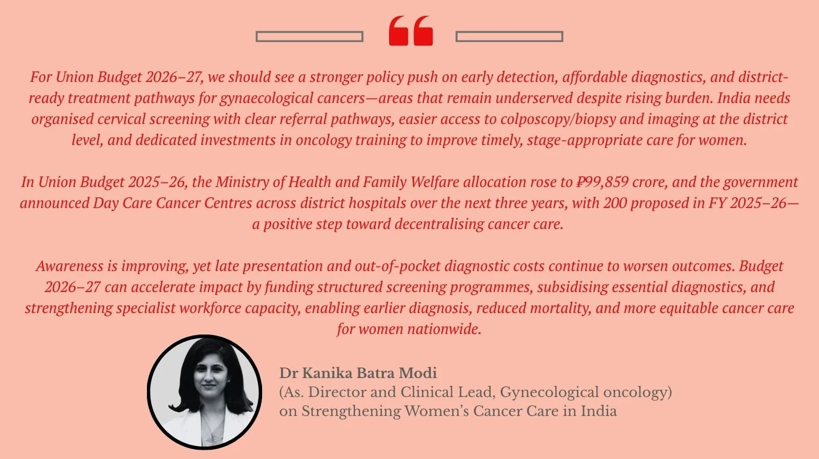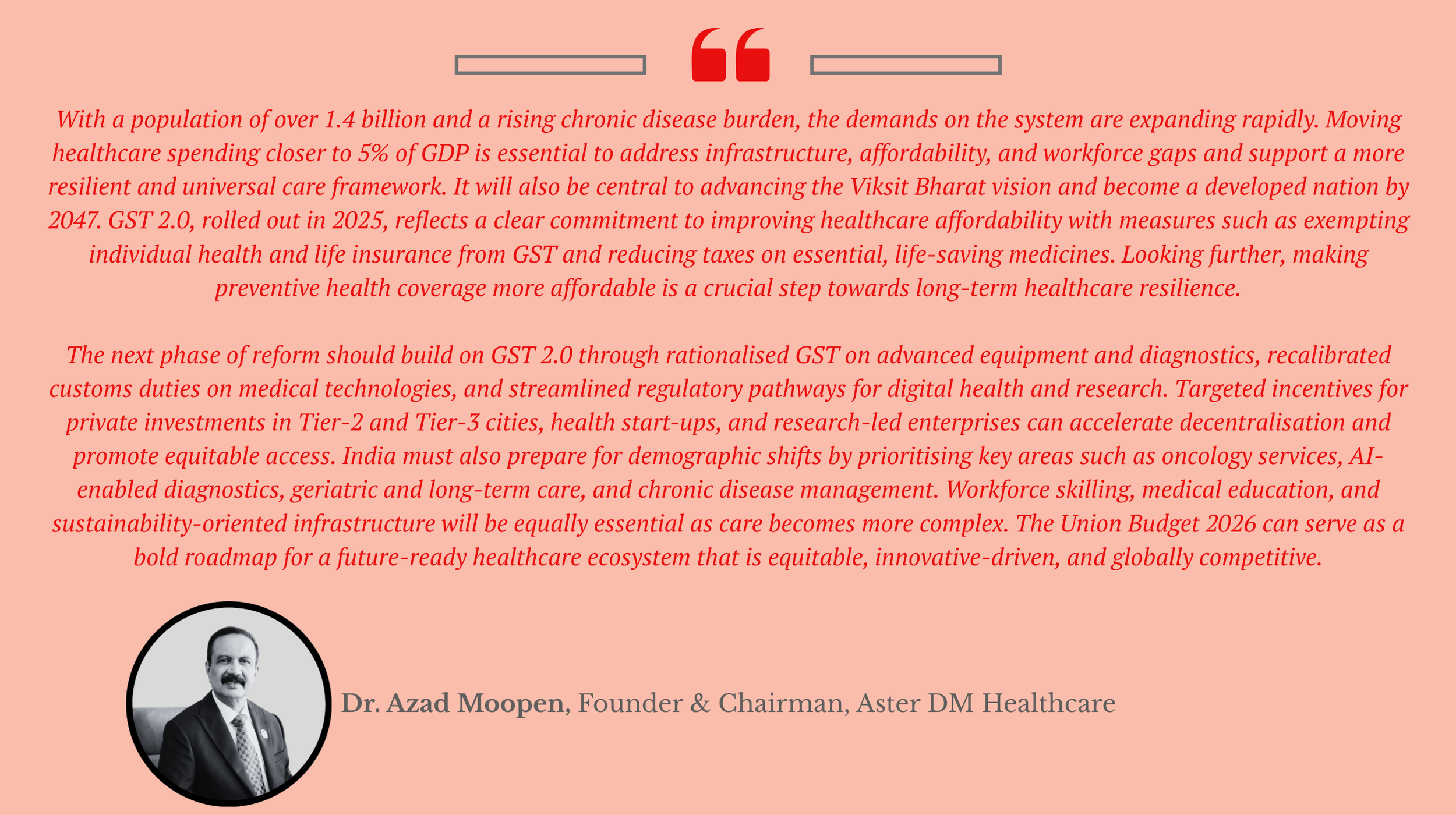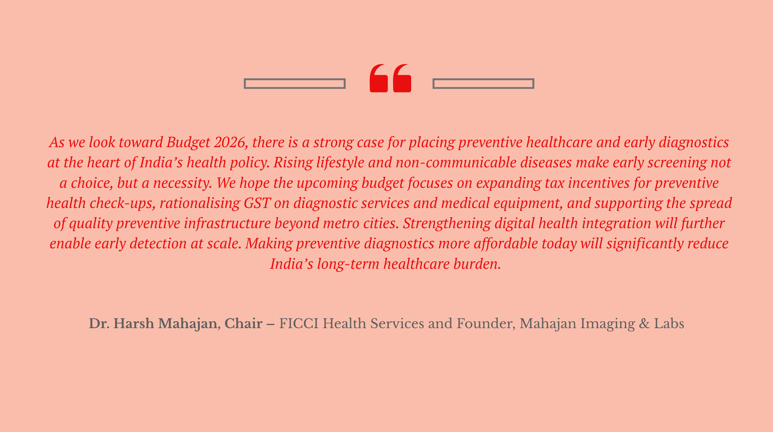 “India’s healthcare sector is entering a defining phase, and Budget 2026 has the potential to shape its growth trajectory for the next decade. With non-communicable diseases such as cancer, diabetes and hypertension rising steadily, the focus must shift towards affordability, preventive care and early diagnosis.”