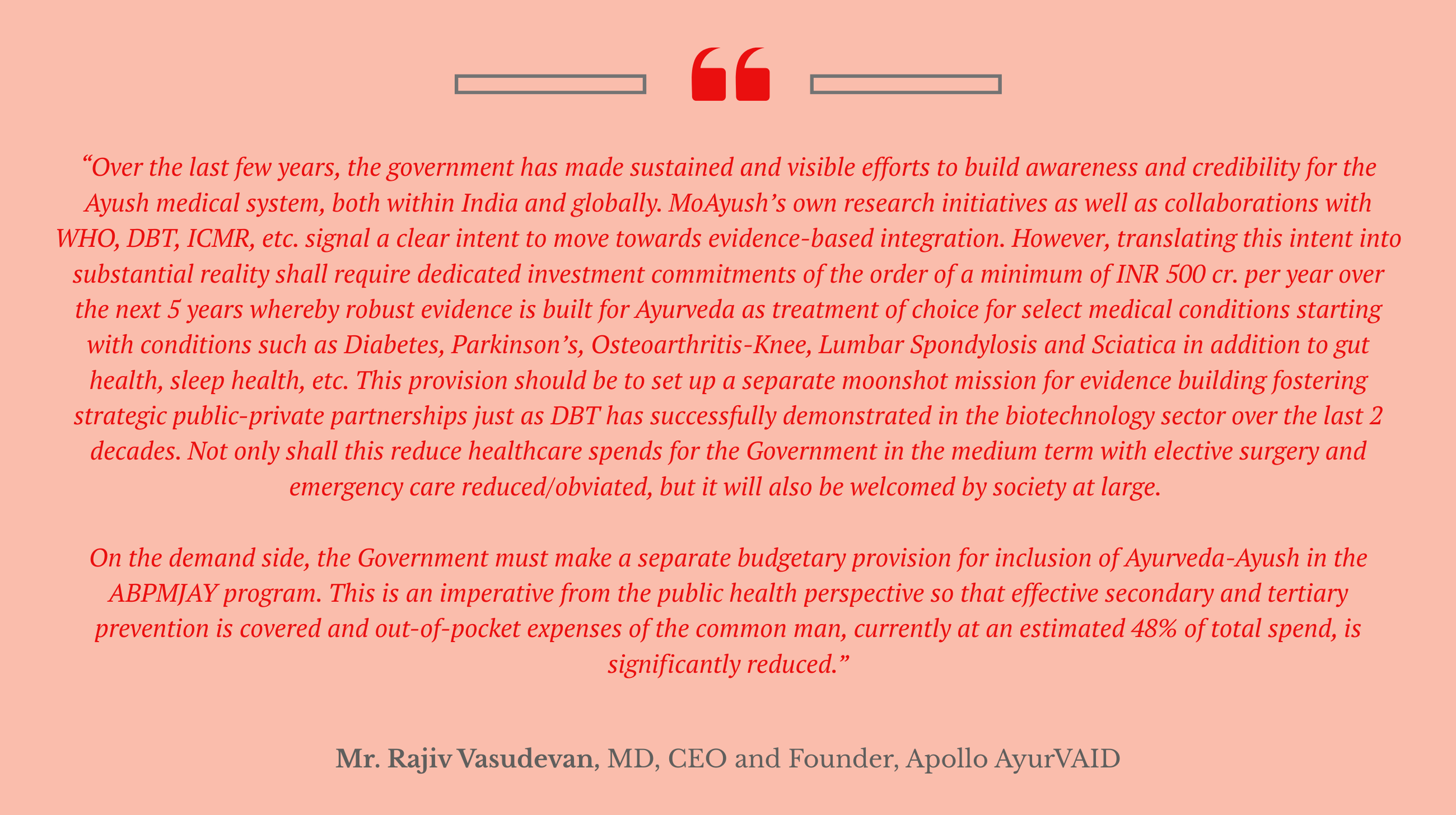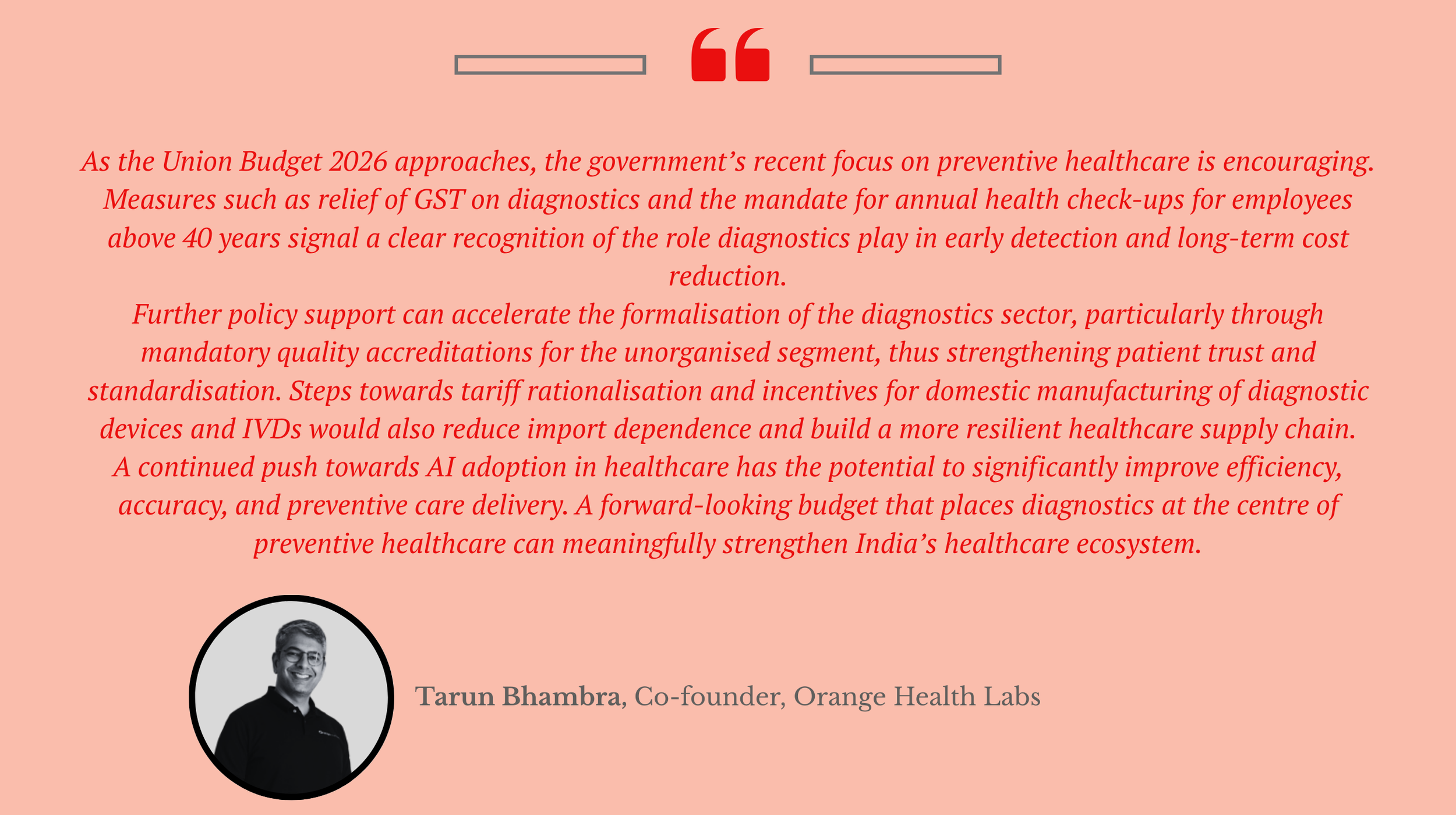 “While the government has made considerable strides in firming up the healthcare industry, the real opportunity for this year’s Union Budget lies in shifting the healthcare conversation from expansion alone to intelligent strengthening of care delivery. While increased public spending is important, equal focus must be placed on how efficiently healthcare reaches patients across the length and breadth of the country.”