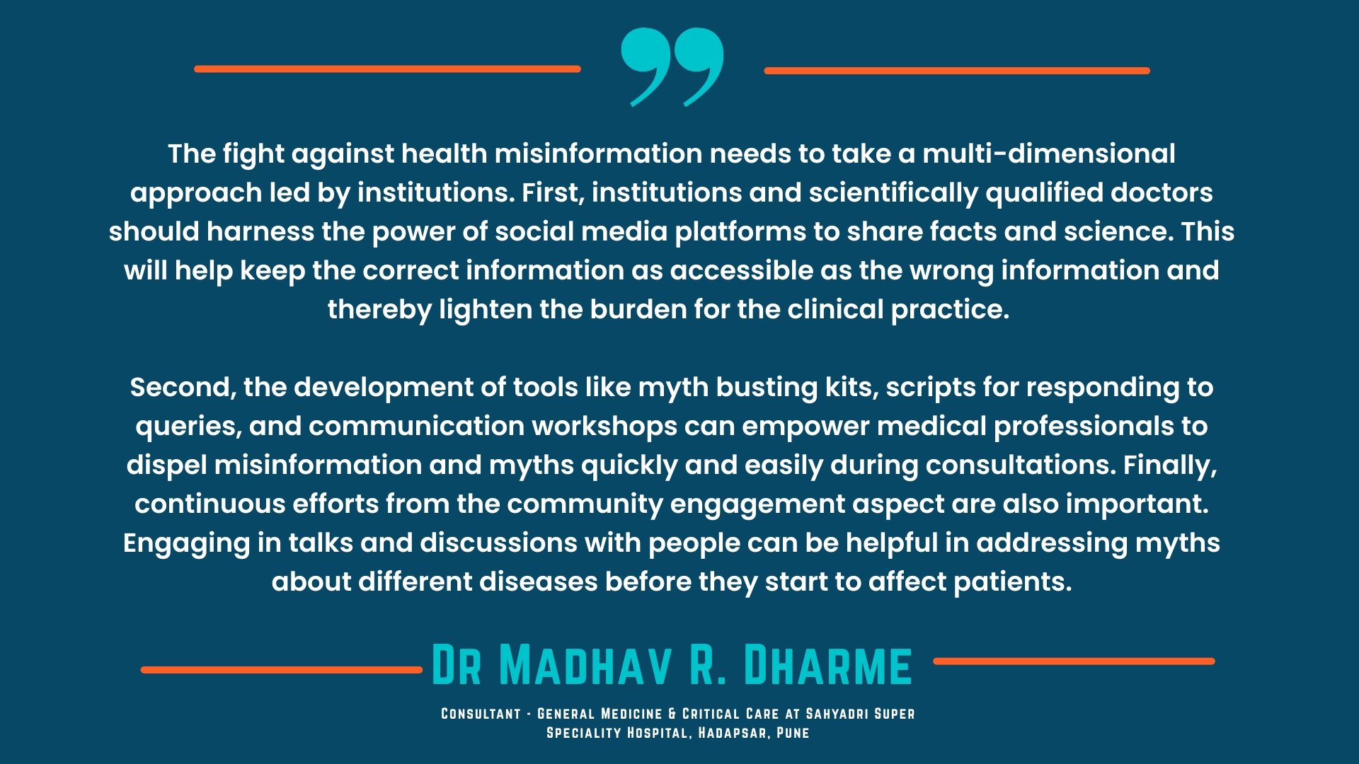 "Second, we need to address the deteriorating doctor–patient relationship. The number of social media influencers who start their unscientific posts with 'Your doctor doesn't want you to know this secret cure' is mind-boggling. There is no punishment for the irreversible harm such posts are doing to society by sowing a deep distrust of the medical fraternity. We cannot stand with science without standing with the people who practice it," he adds.