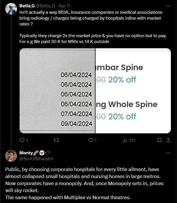 "Standardisation of the pricing of Hospital services is a tricky issue. We cannot easily ascertain the Price of Hospital services like an FMCG product, where the fixed and variable costs can be easily understood. Activity-based costing allows for determining prices for common procedures without complications, such as cataract surgery and hernia repair. Also, the quality of Physical infrastructure, availability and quality of workforce and consumables varies from hospital to hospital. Like the Maximum Retail Price ( MRP ) for an FMCG item, there needs to be a thought on the concept of Maximum Service Price ( MSP ) for hospital services, particularly procedures that can be done after a careful study by Hospital groups, civil society groups and the government. If you take OPD services, you will find huge variations across hospitals and cities. For example, hospital OPD charges in Mumbai are much higher than in Hyderabad or Thiruvananthapuram. The major obstacle in standardising the prices is the complexity and complications in critical areas Like ICU, OT services, etc. In the initial stage, rates can be fixed (Maximum service price ) for laboratory and radiological services. This also comes with a condition." For example, some of the hospitals may be using refurbished equipment, which may compromise patient safety and can get the standardised charge when compared with a healthcare provider who uses the latest state-of-the-art technology in diagnostics," says Feroz Ikbal, Associate Professor at Tata Institute of Social Sciences.